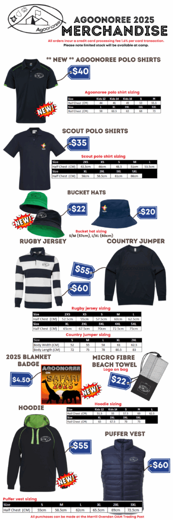Agoonoree Merchandise 2025 will be available at camp from the Merrill Ovenden OAM Trading Post. The trading post takes both card and cash. Unfortunately in 2025 no pre-orders are available.